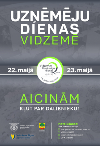 Latvijas lielākās uzņēmēju biedrības Latvijas Tirdzniecības un rūpniecības kameras (LTRK) Vidzemes reģionālā nodaļa aicina pieteikties uzņēmējus, valsts un pašvaldības iestādes, profesionālās un augstākās izglītības iestādes, amatniekus un mājražotājus dalībai “Vidzemes Uzņēmēju dienās 2020”, kas notiks no 22. līdz 23. maijam Valmieras pilsētas centrā.