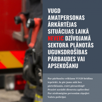 Ņemot vērā informāciju par nenoskaidrotu personu aktivitātēm, apmeklējot mājokļus un maldinot iedzīvotājus, ka pārbauda, vai ir uzstādīti dūmu detektori, Valsts ugunsdzēsības un glābšanas dienests informē, ka ārkārtējas situācijas laikā VUGD amatpersonas neveic dzīvojamā sektora plānotās ugunsdrošības pārbaudes vai apsekošanu.