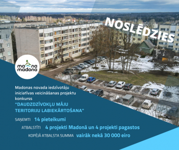 Ir noslēdzies 2021. gada Madonas novada iedzīvotāju iniciatīvas veicināšanas projektu konkurss “Daudzdzīvokļu māju teritoriju labiekārtošana”. Tā ietvaros saņemti 14 pieteikumi, no kuriem 2021. gadā, ņemot vērā ierobežoto projekta finansējuma apjomu, tiek atbalstīti 8 pieteikumi - 4 tiks īstenoti pagastos (Ļaudona, Liezēre, Dzelzava, Barkava) un 4 - Madonas pilsētā.