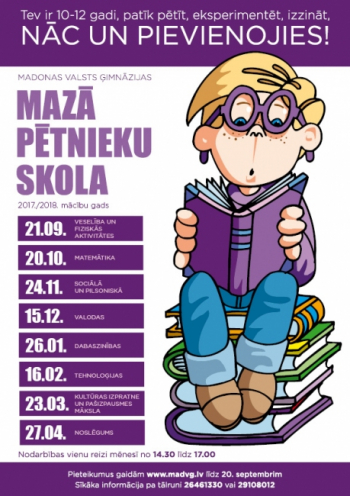 Madonas Valsts ģimnāzijas MAZĀ PĒTNIEKU SKOLA 2017./2018. mācību gadu sāks 21. septembrī plkst. 14.30 Madonas Valsts ģimnāzijā Valdemāra bulvārī 2a.