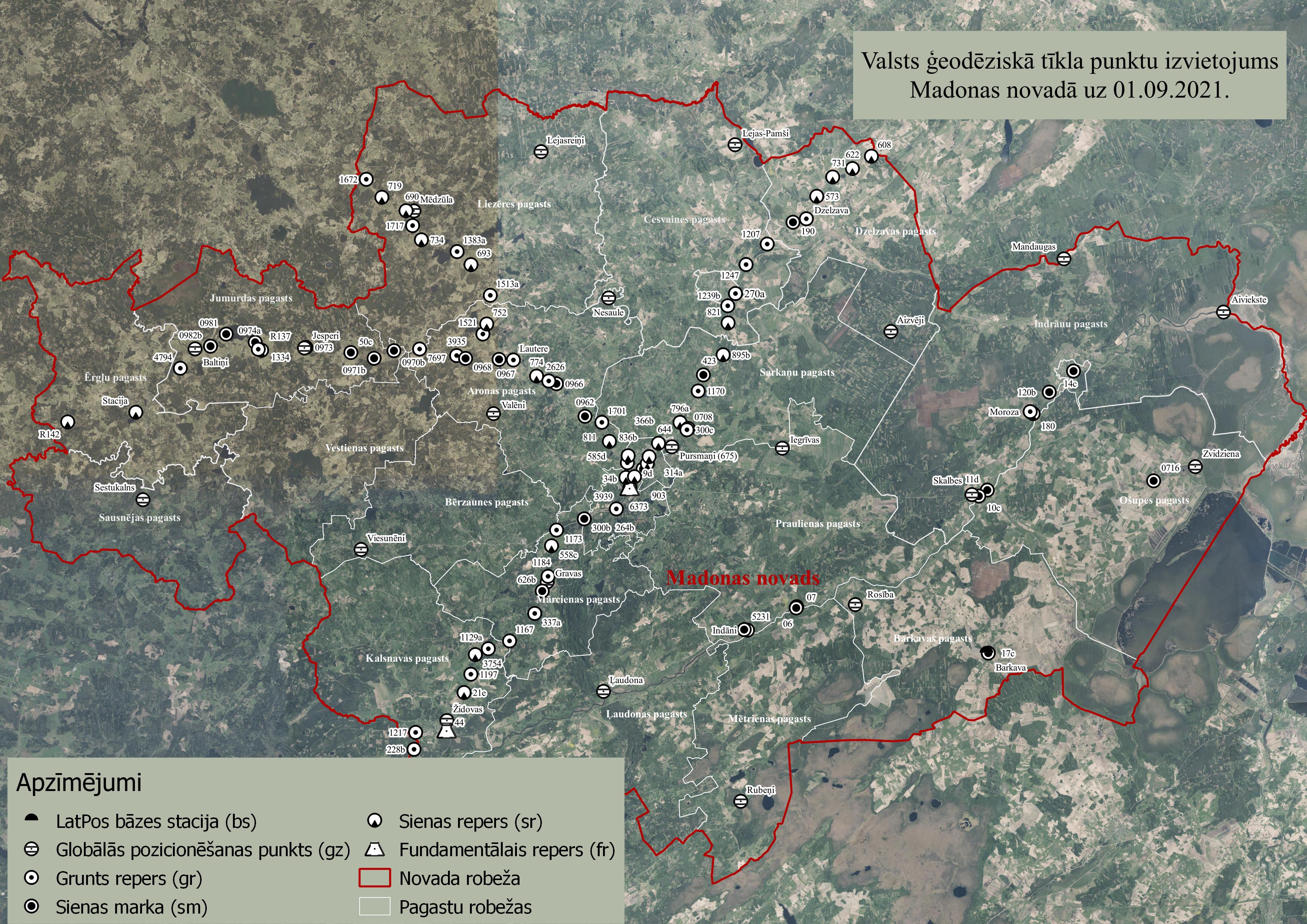 Valsts ģeodēziskā tīkla punktu izvietojuma shēma Madonas novadā.