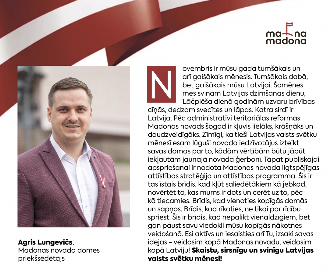 Madonas novada pašvaldības domes priekšsēdētājs Agris Lungevičs uzrunā iedzīvotājus novembra svētkos, aicinot atcerēties, ka vietu, kurā mēs dzīvojam - Latviju un Madonas novadu, veidojam mēs visi kopā.