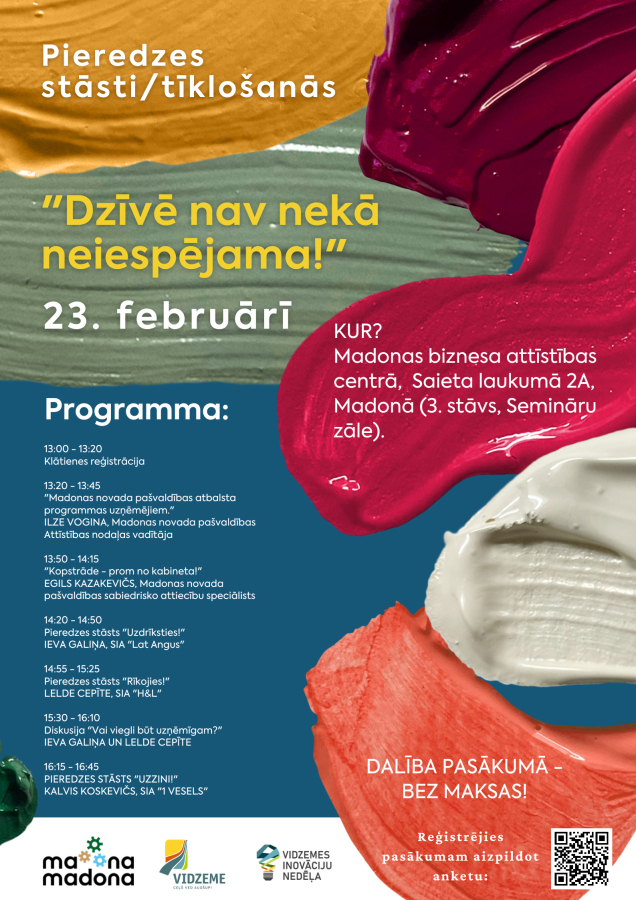 Apmeklē Madonas novada pašvaldības sadarbībā ar Vidzemes plānošanas reģionu rīkoto tīklošanās pasākumu "Dzīvē nav nekā neiespējama!" un uzzini visu par Madonas novada pašvaldības sniegto atbalstu jaunajiem un jau pieredzējušajiem uzņēmējiem, gūsti informāciju par kopstrādes iespējām jaunajā Madonas biznesa attīstības centrā, kā arī noklausies pieredzes stāstus, kas iedvesmo un mudina rīkoties.