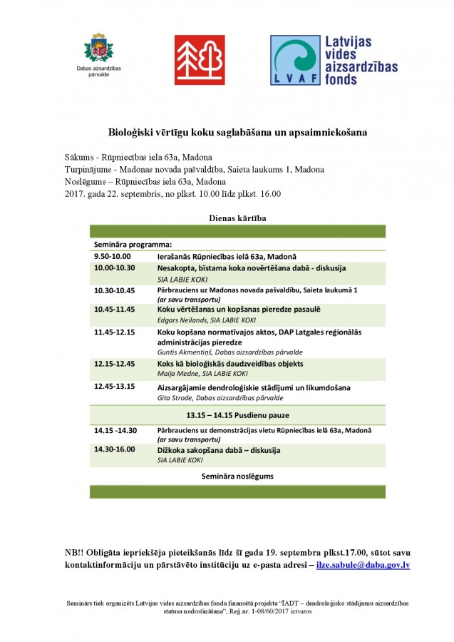 Dabas aizsardzības pārvalde sadarbībā ar SIA "LABIE KOKI" 2017.gada 22.septembrī Madonā organizē semināru "Bioloģiski vērtīgu koku saglabāšana un apsaimniekošana". Interesentiem pieteikšanās no 19.septembra.