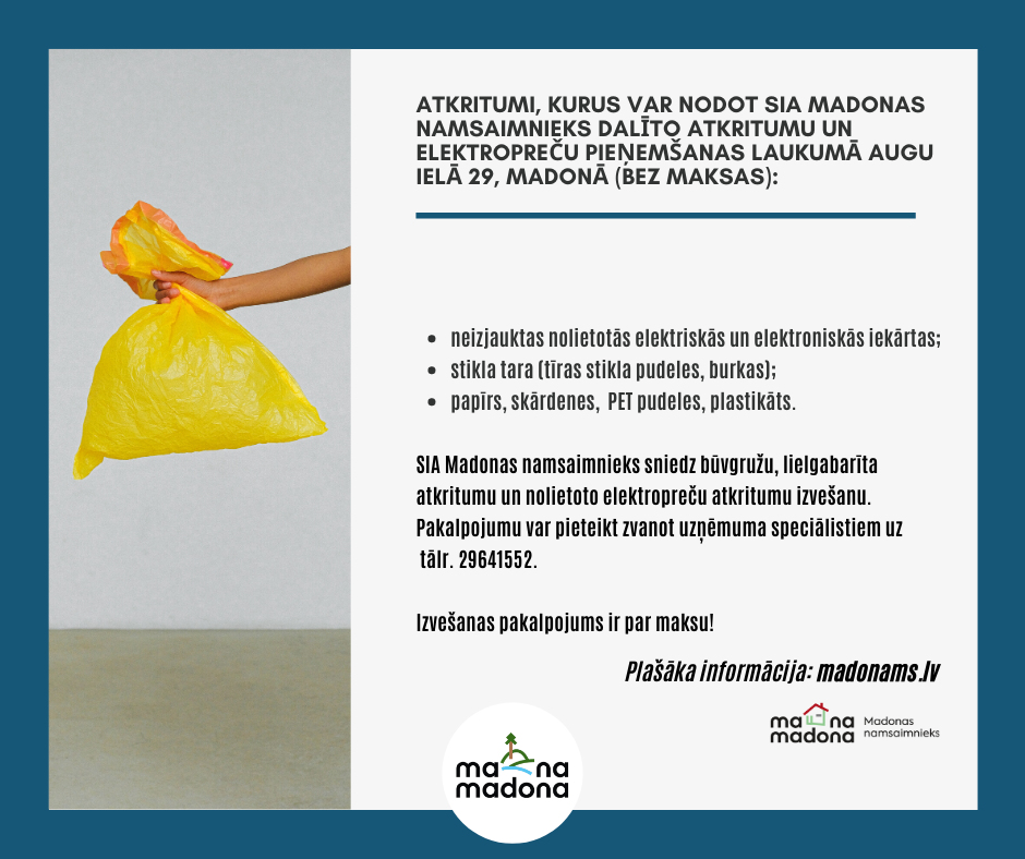 Jāatgādina, ka sašķirotos atkritumus iespējams nogādāt SIA “Madonas namsaimnieks”, Augu ielā 29, kur atrodas četri konteineri blakus nolietoto elektropreču konteineriem. Viens no tiem ir paredzēts stiklam, trīs - papīram, plastmasai un metāla iepakojumam. Pārējos, nešķirojamos atkritumus, jāievieto sadzīves atkritumu konteineros. Liela apjoma atkritumus (lielgabarīta) iespējams nodot Vidusdaugavas SPAAO, Madonā, Augu ielā 29, kur atkritumi tiek nosvērti un par tiem jāsamaksā pēc fakta (84,24 eur/tonna).