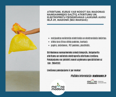 Elektroiekārtas jānodod šķiroto atkritumu laukumos neizjauktas, jo tās satur videi un cilvēkiem bīstamas vielas! Madonā nolietotās elektropreces var nogādāt un bez maksas novietot elektropreču savākšanas vietā SIA “Madonas namsaimnieks” teritorijā Augu ielā 29.