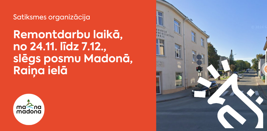 Minētajā laika posmā tiks slēgta satiksme Raiņa ielā, Madonā, 20 m garā posmā no krustojuma ar Saules ielu, līdz iebrauktuvei privātīpašuma stāvlaukumā ar adresi Saules iela 15.