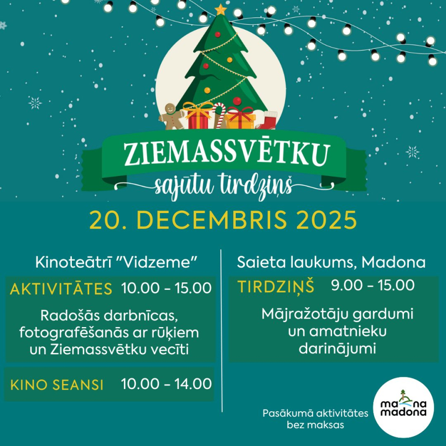 Ziemassvētku sajūtu tirdziņa ietvaros, 20. decembrī, esiet aicināti iegriezties arī kinoteātrī "Vidzeme", kur Jūs sagaidīs gan dažādas radošās darbnīcas, gan fotografēšanās ar rūķiem un Ziemassvētku vecīti.