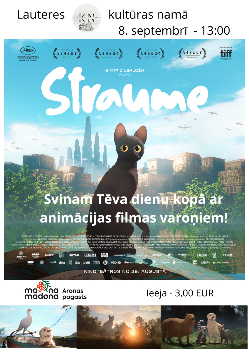 Piedāvājam noskatīties jaunu latviešu animācijas filmu - Kannu kinofestivālā pasauli pārsteigušo Ginta Zilbaloža pilnmetrāžas animāciju STRAUME. Filma ir sensācija, jo no kino jomā tik nelielas valsts kā Latvija neviens negaidīja tik grandiozu rezultātu - sajūsma par šo filmu tiek pausta visnozīmīgākajos pasaules kino izdevumos un nepieredzēti liels daudzums valstu to jau ir iegādājuši demonstrēšanai uz lielajiem ekrāniem kinoteāros. Filma tikko ieguva 4 balvas pasaulē visnozīmīgajā animācijas festivālā Ansī Francijā - un līdzās citām balvām tā saņēma skatītāju balvu tūkstoš filmu konkurencē.