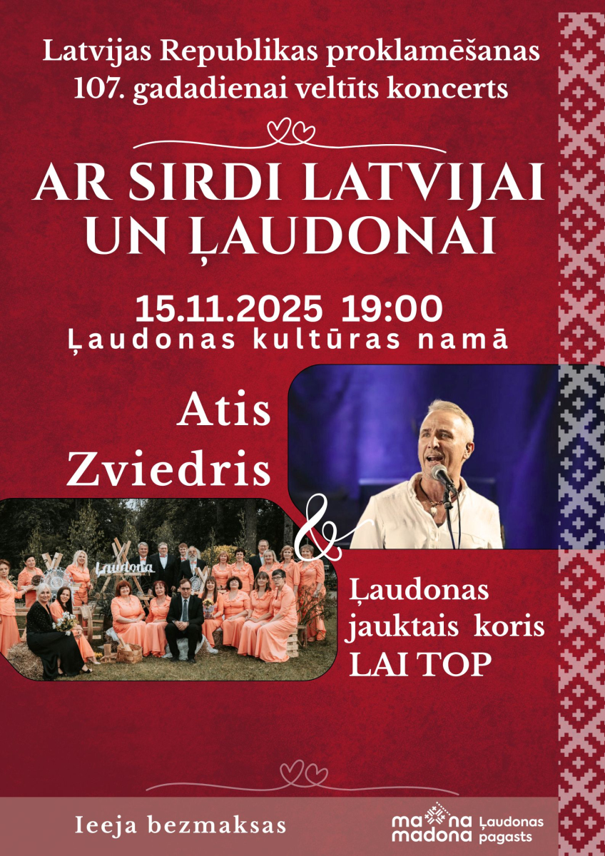 Aicinām Latvijas Republikas proklamēšanas 107. gadadienai veltītu koncertu “Ar sirdi Latvijai un Ļaudonai”.