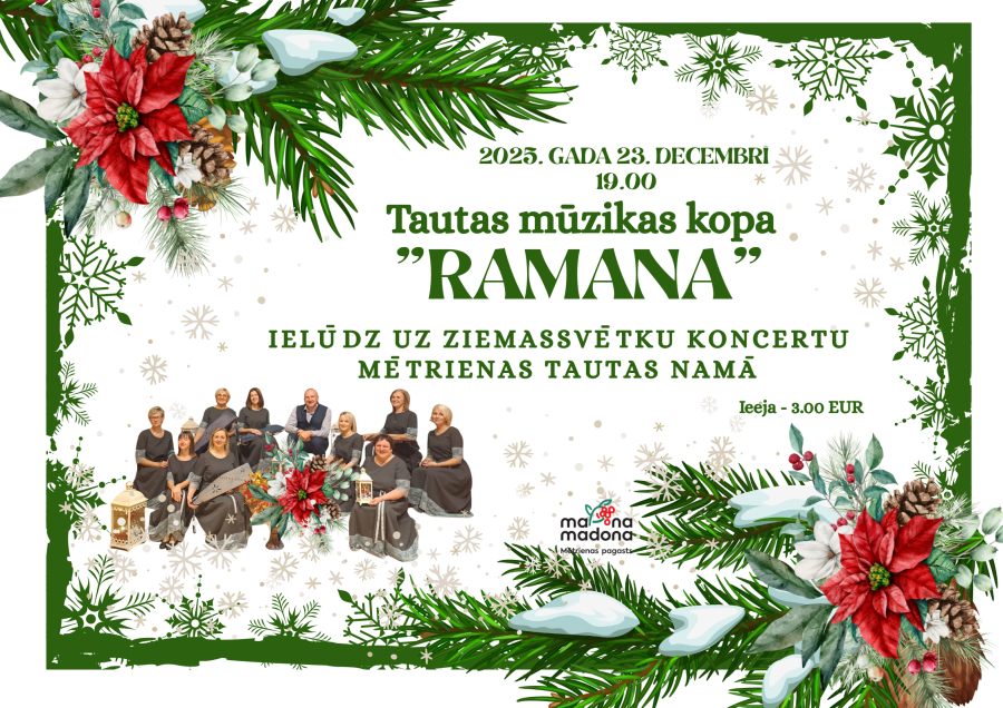 Mētrienas tautas nama tautas mūzikas kopa “Ramana” ielūdz uz Ziemassvētku koncertu. Skanēs tautas dziesmu apdares, Ziemassvētku dziesmas, kokļu mūzika.