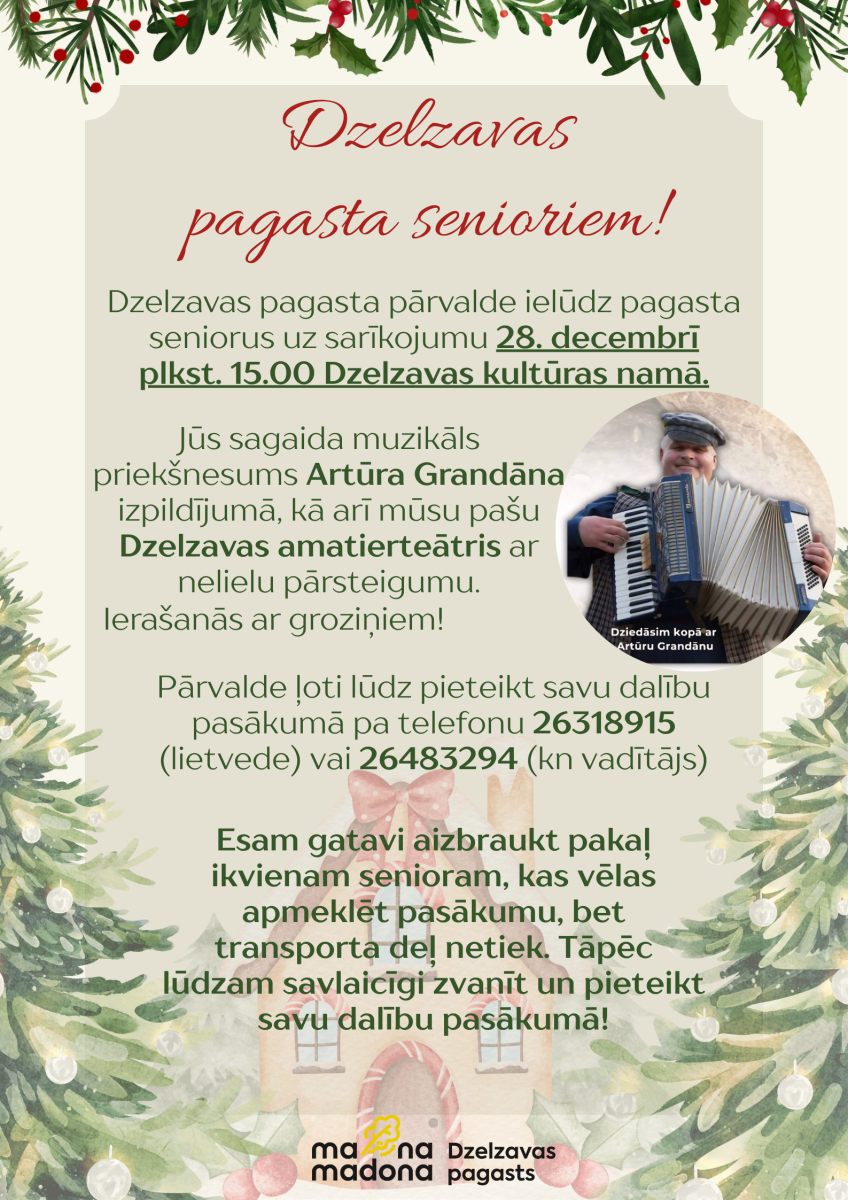 28. decembrī plkst. 15.00 Dzelzavas pagasta pārvalde ielūdz Dzelzavas pagasta seniorus uz gadumijas sarīkojumu, kur ar muzikālu priekšnesumu priecēs Artūrs Grandāns, kā arī Dzelzavas amatierteātris.