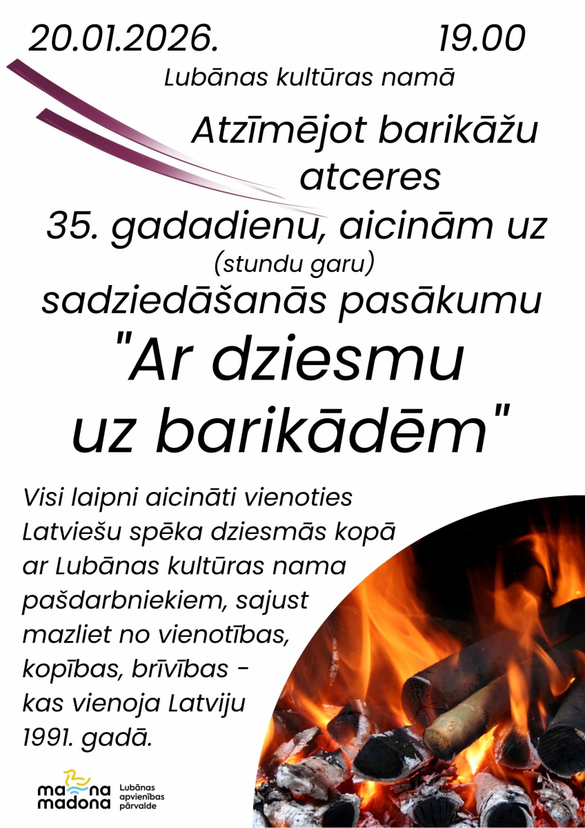 2026. gada 20. janvārī plkst. 19.00 Lubānas kultūras namā - sadziedāšanās pasākums "Ar dziesmu uz barikādēm".