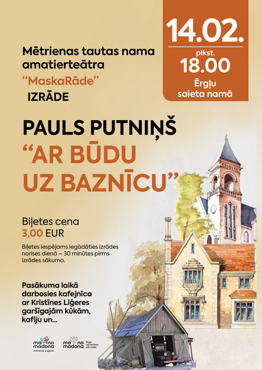 2026. gada 14. februārī plkst. 18.00 Ērgļu saieta namā aicinām uz Mētrienas pagasta amatierteātra “MaskaRāde” izrādi - Paula Putniņa komēdiju “Ar būdu uz baznīcu”.