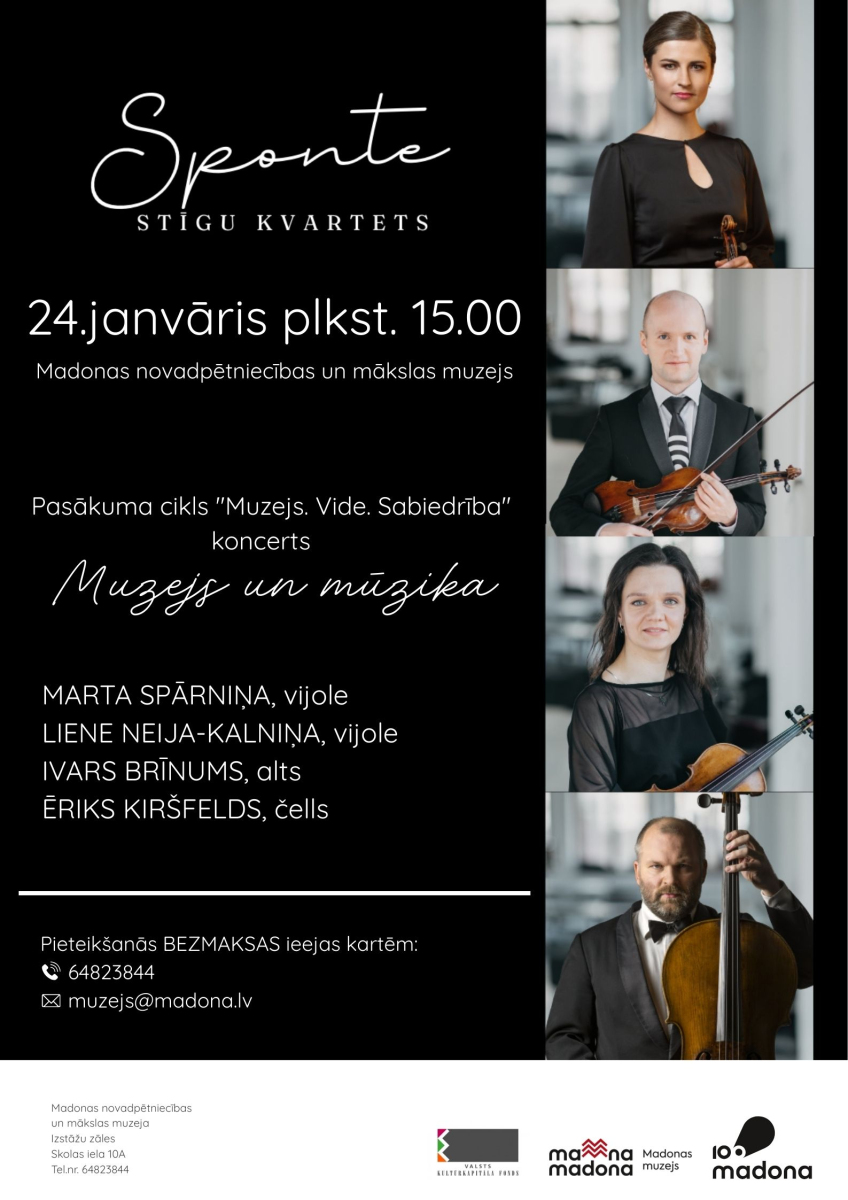 2026.gada 24. janvārī plkst. 15.00 Madonas novadpētniecības un mākslas muzeja Izstāžu zālēs viesosies stīgu kvartets Sponte, aicinot klausītājus uz koncertu “Muzejs un mūzika”, kas notiks pasākumu cikla “Muzejs. Vide. Sabiedrība” ietvaros.