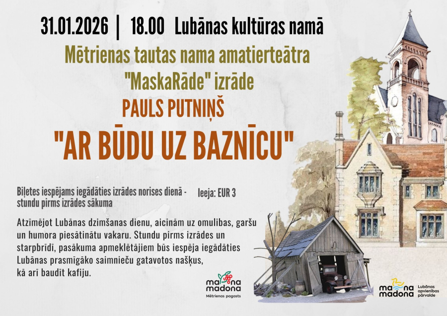 31. janvārī plkst. 18.00 Lubānas kultūras namā skatītāji aicināti uz Mētrienas tautas nama amatierteātra "MaskaRāde" izrādi "Ar būdu uz baznīcu".