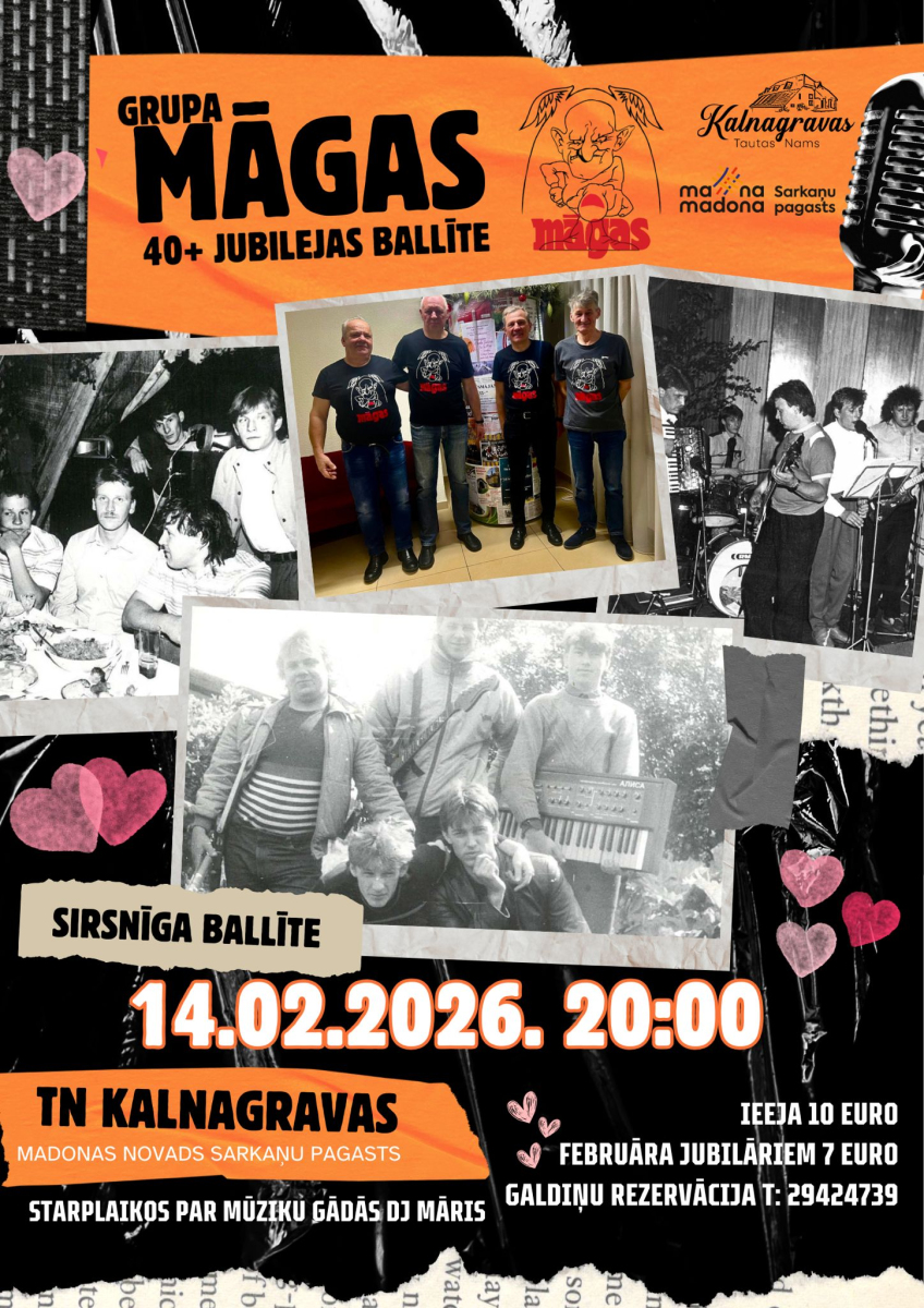 Uz sirsnīgu Valentīndienas ballīti tautas namā KALNAGRAVAS aicina grupa MĀGAS, kas atskatīsies uz saviem 40+ gadiem.