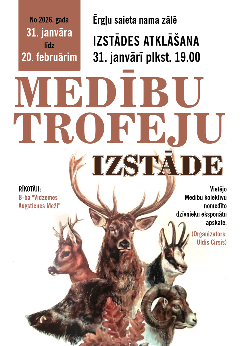 Par ierosmi šai izstādei tapa MEŽA BALLE, ko savas darbības 20. gadu jubilejai 31. janvārī rīko biedrība “Vidzemes Augstienes Meži”. Medību trofeju izstāde būs skatāma Ērgļu saieta namā līdz 20. februārim.