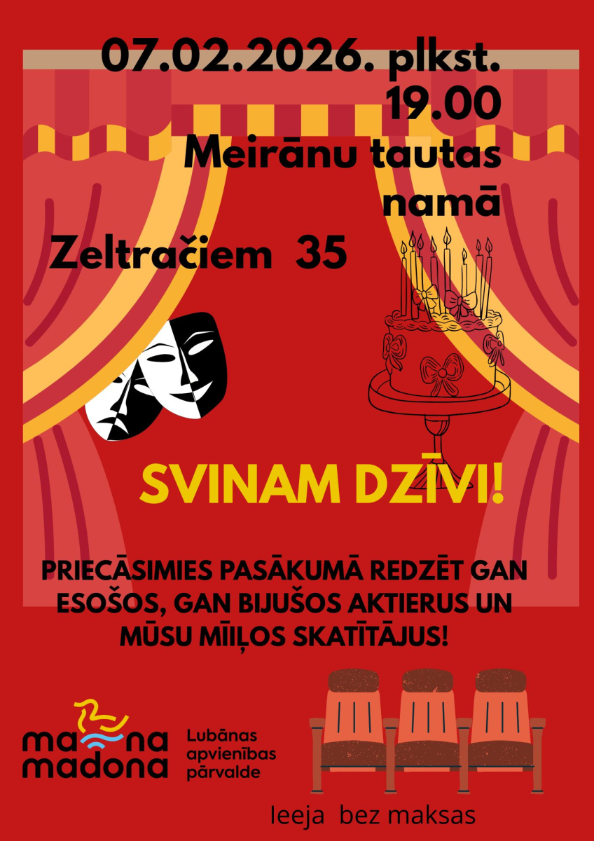 Esiet aicināti uz Meirānu tautas nama amatierteātra "Zeltrači" 35 gadu jubilejas svinībām 7. februārī plkst. 19.00.