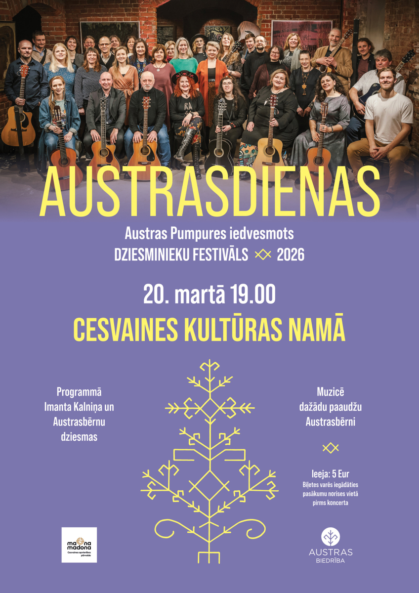 20. martā plkst. 19.00 Cesvaines kultūras namā atkal satiksies domubiedri, lai svinētu dziesmu, piederību un Austras Pumpures iedvesmoto muzikālo mantojumu dziesminieku festivālā “Austrasdienas 2026”.