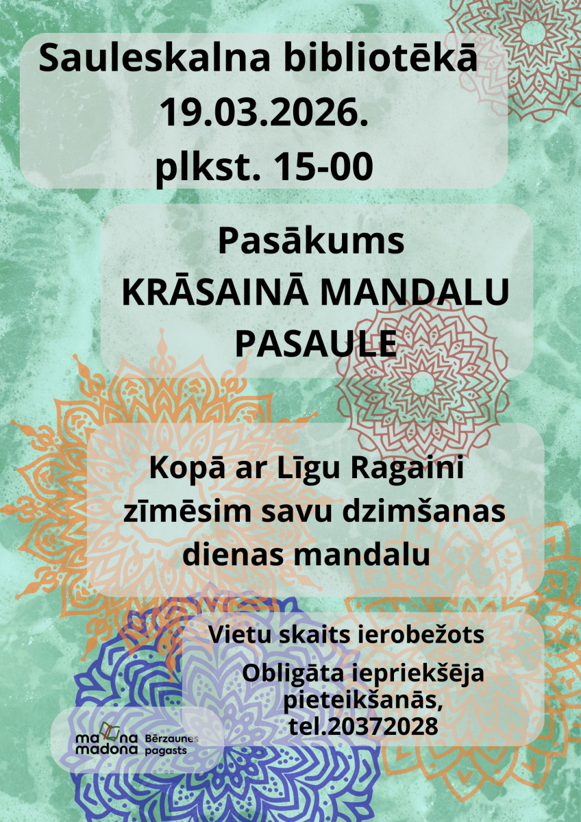 Lai turpinātu izzināt mandalu noslēpumaino pasauli, 19. martā plkst. 15-00 Bērzaunes pagasta bibliotēkā Sauleskalnā interesenti tiek aicināti uz pasākumu "Krāsainā mandalu pasaule". Šajā reizē, Līgas Ragaines pamācīti, mierīgā un radošā atmosfērā, zīmēsim katrs savu dzimšanas dienas mandalu, aprēķinos izmantosim savus dzimšanas datus.