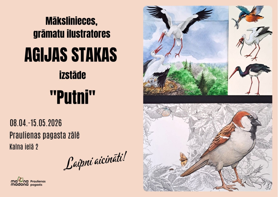 No 8. aprīļa līdz 15. maijam Praulienas bibliotēka aicina apskatīt mākslinieces, grāmatu ilustratores Agijas Stakas izstādi “Putni”.