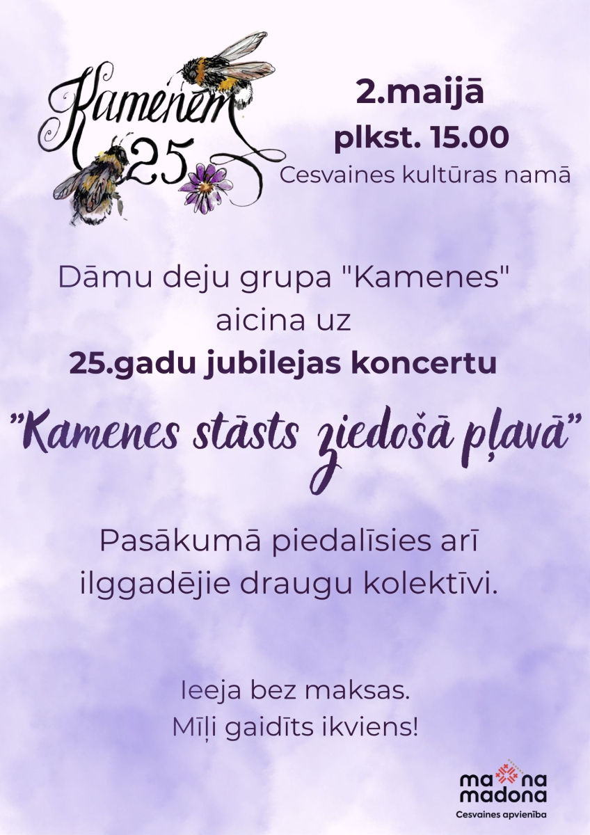 Dāmu deju grupa “Kamenes” vadītājas Ilzes Purpļevičas vadībā aicina uz īpašu notikumu – savu 25 gadu jubilejas koncertu “Kamenes stāsts ziedošā pļavā”, kas notiks 2. maijā plkst. 15.00 Cesvaines kultūras namā.