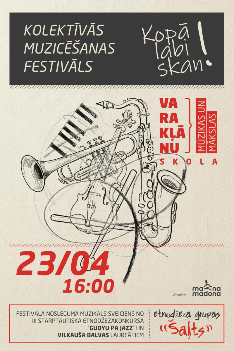 2026.gada 23. aprīlī plkst. 16.00 Varakļānu Mūzikas un māksla skolā notiks kolektīvās muzicēšanas festivāls “Kopā labi skan!”.