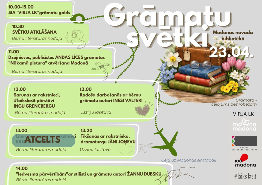 23. aprīlī Madonas novada bibliotēkā norisināsies īpaši Grāmatu svētki, kas pulcēs literatūras cienītājus, autorus un radošās personības visas dienas garumā. Pasākums piedāvā bagātīgu programmu gan bērniem, gan pieaugušajiem, aicinot iepazīt grāmatu pasauli kā nebeidzamu ceļojumu.