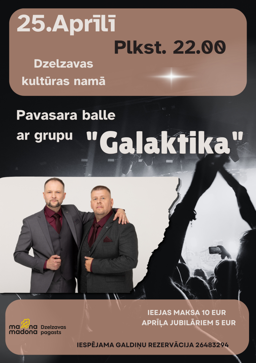25. aprīlī Dzelzavas kultūras namā pavasara balle ar grupu “Galaktika”.