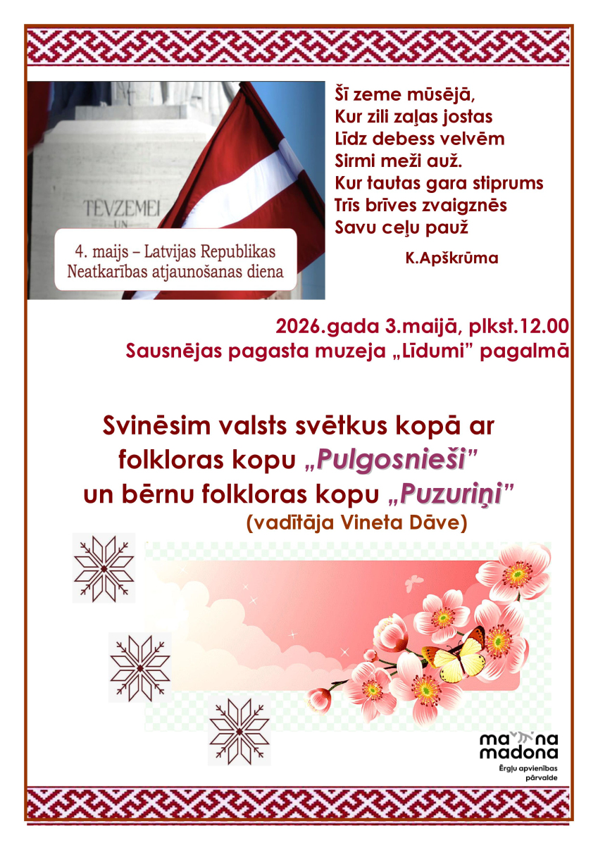 Sausnējā svinēsim Latvijas Republikas Neatkarības atjaunošanas svētkus, būsim kopā ar folkloras kopu „Pulgosnieši” un bērnu folkloras kopu „Puzuriņi” no Ērgļiem. Kolektīvu vadītāja – Vineta Dāve.