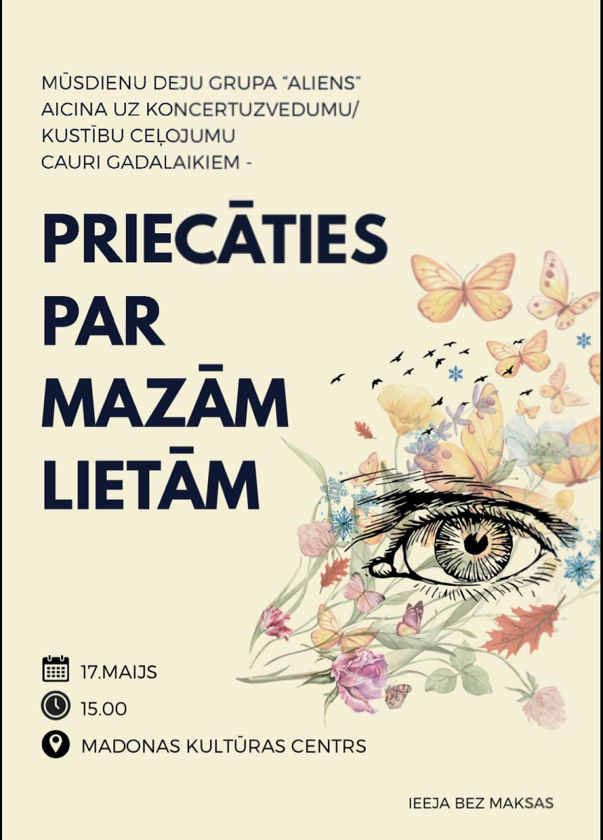 Koncertuzvedums “Priecāties par mazām lietām ” būs kustības piepildīts ceļojums cauri gadalaikiem. Dejas stāsts vīsies ap galveno varoni, kura ikdienā daudz strādā, raizējas, vairs nespēj rast prieku savā dzīvē, un kurai nav laika sev tuvajiem cilvēkiem.