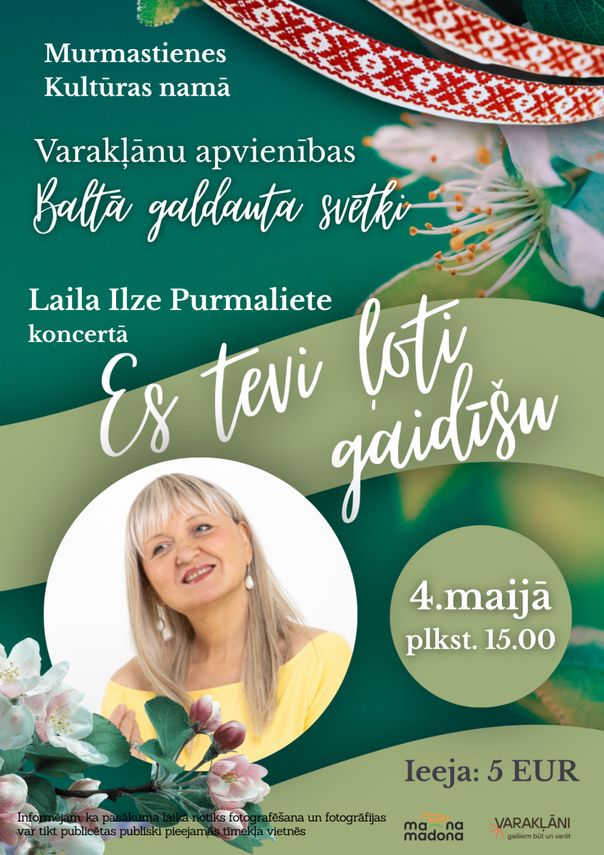 Baltā galdauta svētki ir tradīcija, kas aicina cilvēkus svinēt kopā būšanu un godināt brīvību. Murmastienes kultūras nams šajā dienā radīs īpašu svētku atmosfēru, kurā mūzika un dzeja savīsies ar pavasara ziedēšanas noskaņām. Šogad svētkus bagātinās populārās dziesmu autores un izpildītājas Lailas Ilzes Purmalietes koncertprogramma "Es tevi ļoti gaidīšu". Laila Ilze Purmaliete ir pazīstama ar savām melodiskajām, emocionāli piepildītajām dziesmām, kas uzrunā katra klausītāja sirdi.