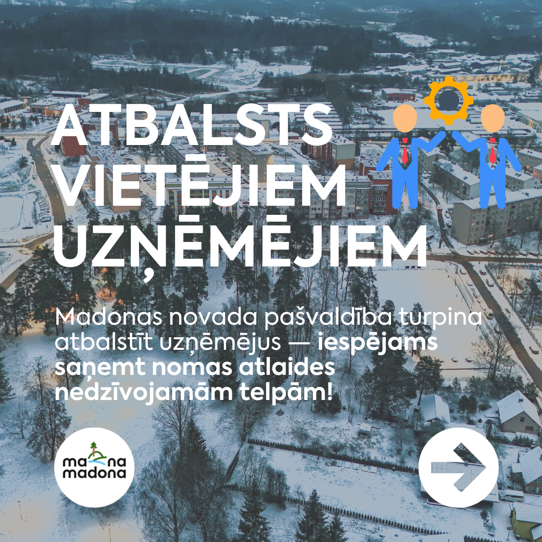 Madonas novada pašvaldība aicina vietējos uzņēmējus izmantot iespēju samazināt telpu nomas izmaksas un novirzīt investīcijas uzņēmuma attīstībai, jaunu darba vietu izveidei vai  sabiedrībai nozīmīgu projektu īstenošanai.