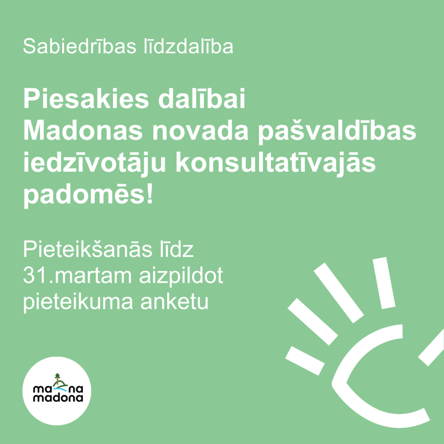 - Ja tev ir uz izpēti un sabiedrības viedokli pamatoti ierosinājumi konceptuāliem ilgtspējīgiem publiskās infrastruktūras, vides un pakalpojumu attīstības risinājumiem Madonas novada teritorijā, piesaki savu dalību Konsultatīvajā padomē teritoriālās attīstības un vides jautājumos.