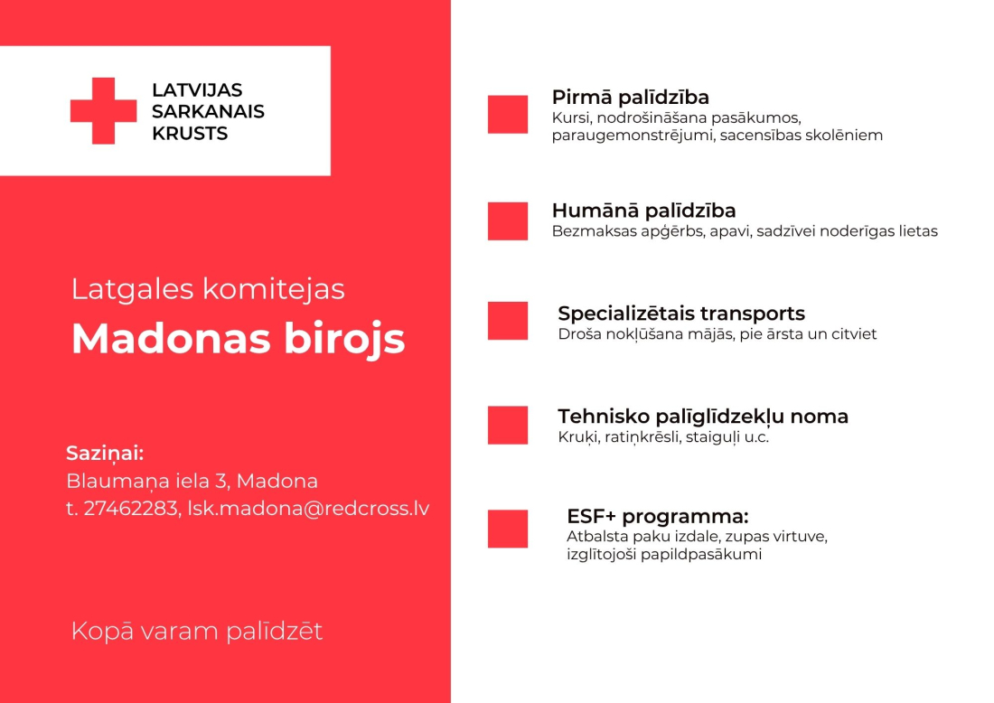 Biedrība „Latvijas Sarkanais Krusts" Madonas nodaļa informē par sniegtajiem pakalpojumiem Madonas novadā.