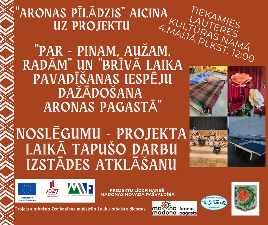 Kopš 2025.gada jūnija biedrība "ARONAS PĪLĀDZIS" aktīvi darbojās, lai realizētu 2 vērienīgus LEADER projektus Aronas pagasta Kusā, MC "1.stāvs" telpās un tā apkārtnē. Nu ir pienācis laiks atskatīties uz paveikto, tāpēc aicinām pirmdien, 4.maijā plkst.12:00 Lauteres kultūras namā uz abu projektu noslēguma pasākumu. Tiks atklāta projekta "PAR - Pinam, Aužam, Radām" laikā tapušo darbu izstāde, kā arī būs iespēja ģimenes un draugu lokā uzspēlēt dažas lielformāta spēles.