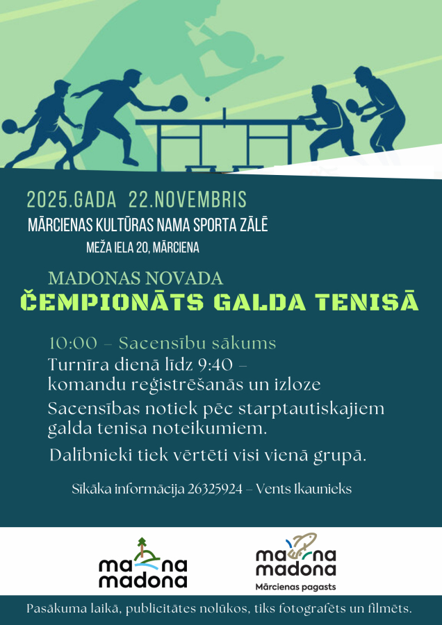Mārcienas kultūras nama sporta zālē, Meža ielā 20, 2025.gada 22.novembrī uz Madonas novada čempionātu galda tenisā aicināti visi galda tenisa spēles entuziasti. kas pārzin galda tenisa spēles noteikumus un vēlas paaugstināt savu spēlētprasmi.