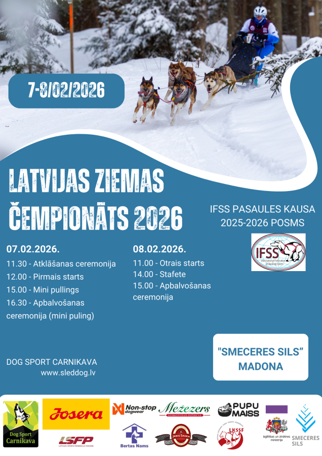 Latvijas ziemas čempionāts 2026 un IFSS Pasaules kausa posms 2025-2026, suņu kamanu sacensības SAB "Smeceres sils"sporta bāzē
