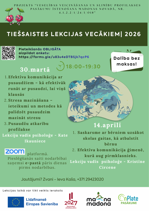 Madonas novada pašvaldība, sadarbībā ar SIA OnPlate Pasākumi aicina vecākus pievienoties BEZMAKSAS TIEŠSAISTES LEKCIJĀM par psiholoģiskās labklājības veicināšanu ģimenēs, kurās aug bērni.