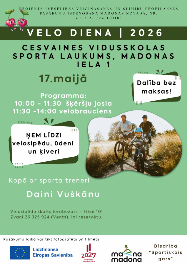 Projekta “Veselības veicināšanas un slimību profilakses pasākumu īstenošana Madonas novadā” ietvaros (projekta Nr. 4.1.2.2/1/24/I/018) 2026. gada 17.maijā Cesvaines vidusskolas sporta laukumā, Madonas iela 1, notiks Velo diena kopā ar sporta treneri Daini Vuškānu.