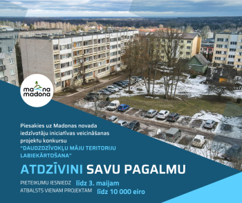 “Publiskā telpa ir dzīva tikai tad, kad tā funkcionē un iedzīvotāji to aktīvi izmanto savu vajadzību īstenošanai. Lai veicinātu novada iedzīvotāju iesaisti savas apkārtējās dzīves vides sakārtošanā, sadarbību ar pašvaldību, līdzdalību un priekšstatu maiņu par iedzīvotāju lomu kopējās pagalmu telpas labiekārtošanā, Madonas novada pašvaldība šogad īstenos iedzīvotāju iniciatīvas veicināšanas projektu konkursu “Daudzdzīvokļu māju teritoriju labiekārtošana”, vēršot uzmanību uz savstarpējo komunikāciju, sadarbību un līdzdalību kā veiksmīgu pamatu kvalitatīvas pilsētvides veidošanā”, nepieciešamību sniegt atbalstu iedzīvotāju iniciatīvām, no kuras labumu gūst plašāka sabiedrība, akcentē Ilze Vogina.