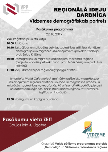 Valsts pētījumu programmas projekts “DemoMig” un Vidzemes plānošanas reģions aicina uz “Reģionālo ideju darbnīcu: Vidzemes demogrāfiskais portrets”, kas 22. oktobrī notiks Līgatnē, pasākumu vietā ZEIT, Gaujas ielā 4.