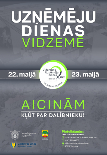 Latvijas lielākās uzņēmēju biedrības Latvijas Tirdzniecības un rūpniecības kameras (LTRK) Vidzemes reģionālā nodaļa aicina pieteikties uzņēmējus, valsts un pašvaldības iestādes, profesionālās un augstākās izglītības iestādes, amatniekus un mājražotājus dalībai “Vidzemes Uzņēmēju dienās 2020”, kas notiks no 22. līdz 23. maijam Valmieras pilsētas centrā.