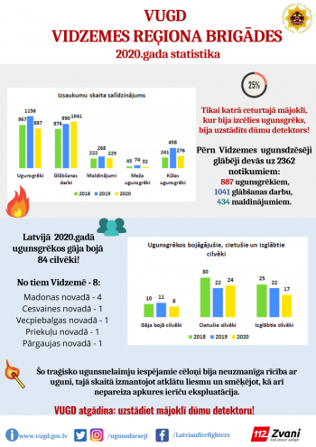 Valsts ugunsdzēsības un glābšanas dienesta (turpmāk – VUGD) apkopotā statistika liecina, ka 2020. gadā Vidzemes reģionā nedaudz samazinājies kopējais izsaukumu skaits (tajā skaitā arī uz ugunsgrēku dzēšanu), kā arī mazinājies ugunsgrēkos bojāgājušo skaits, taču pieaudzis izsaukumu skaits uz glābšanas darbiem.