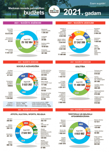 Janvāra nogalē ar Madonas novada pašvaldības domes lēmumu apstiprināts Madonas novada pašvaldības 2021.gada budžets. Novada pamatbudžets 2021. gadam ieņēmumos ir apstiprināts 25 162 984 eiro, bet izdevumos –27 242 399 eiro. Salīdzinot ar 2020. gada sākumu, ieņēmumi samazinājušies par 905 041 eiro, bet izdevumi pieauguši par 1 174 374 eiro. Naudas līdzekļu un noguldījumu atlikums gada sākumā 6 519 718 eiro. Atlikuma palielinājums salīdzinot ar 2020. gada sākumu –641 474 eiro.