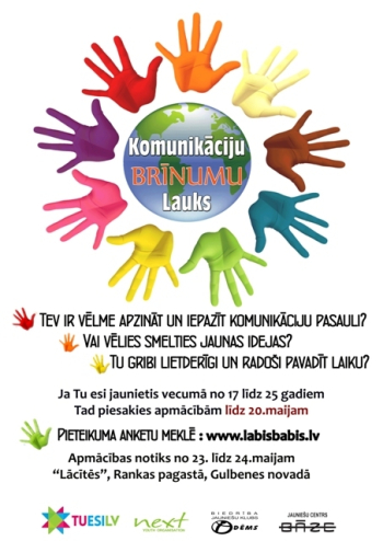 23. – 24.maijā viesu namā “Lācītes”, Rankas pagastā, Gulbenes novadā notiks divu dienu apmācības “Komunikāciju brīnumu lauks”. Apmācību mērķis ir uzlabot jauniešu komunikācijas un sadarbības prasmes. Dalībniekiem būs iespēja gūt jaunas zināšanas par komunikāciju lomu vietējās sabiedrības attīstībā, karjeras veidošanā un dzīves kvalitātes paaugstināšanā. Apmācības “Komunikāciju brīnumu lauks” tiek rīkotas biedrības “Next” un “Jauniešu klubs ”Dēms”” projekta “TU.ESI.LV” ietvaros sadarbībā ar jauniešu centru “Bāze”.