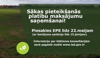 No šā gada 11.aprīļa sākas pieteikšanās platību maksājumiem. Lauksaimnieki tiem var pieteikties līdz šā gada 22.maijam, iesniedzot Vienoto iesniegumu LAD Elektroniskajā pieteikšanās sistēmā (EPS). Pēdējā diena, kad atbalsta maksājumiem varēs pieteikties ar kavējuma sankciju, ir 15.jūnijs.
