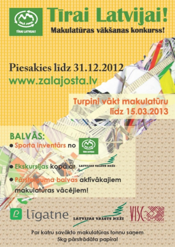 „Zaļā josta” uzsāk Latvijas zaļākā novada un pilsētas meklējumus, aicinot Latvijas vispārējās, pirmsskolas un profesionālās izglītības iestādes iesaistīties praktiskajā makulatūras vākšanas konkursā „Tīrai Latvijai”. Par zaļāko novadu un zaļāko pilsētu kļūs attiecīgi tas novads un Latvijas Republikas pilsēta, kuras izglītības iestādes savāks un konkursa ietvaros pārstrādei nodos visvairāk makulatūras – papīru, žurnālus un kartona izstrādājumus.