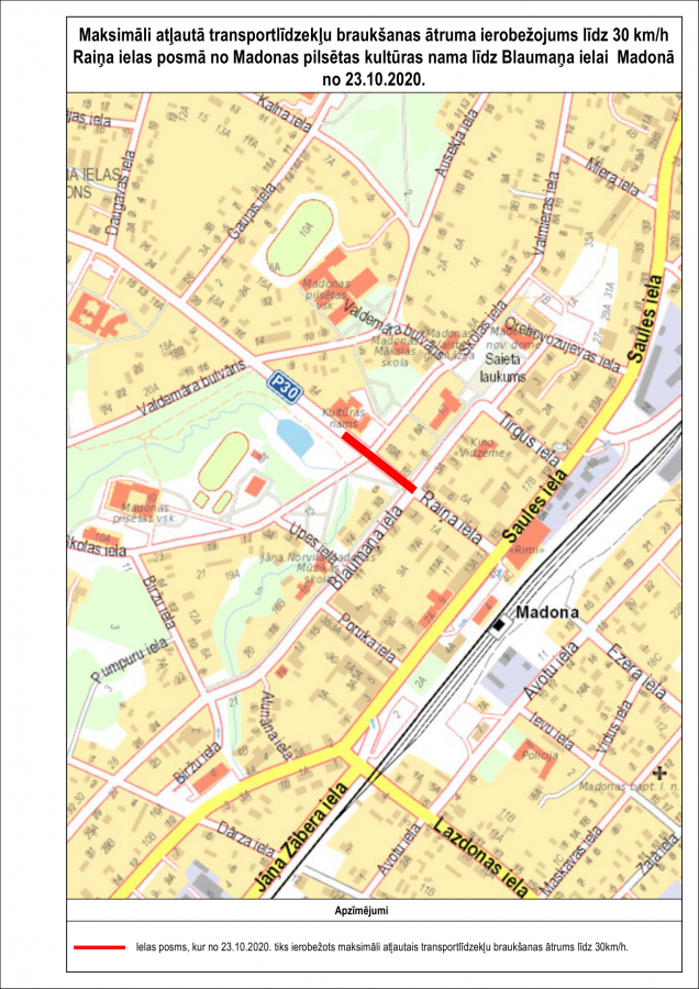 Ņemot vērā Valsts policijas Vidzemes reģiona pārvaldes Madonas iecirkņa ieteikumus, lai uzlabotu satiksmes drošību no 23.10.2020. tiks ierobežots maksimāli atļautais transportlīdzekļu braukšanas ātrums līdz 30 km/h Raiņa ielas posmā no Madonas pilsētas kultūras nama līdz Blaumaņa ielai Madonā, uzstādot šajā posmā abos Raiņa ielas virzienos ceļa zīmes Nr.323 “Maksimālā ātruma ierobežojums 30 km/h” ar papildzīmēm Nr.828 “Darbības laiks darba dienās laika posmā no plkst.7:00 līdz plkst.16:00”.